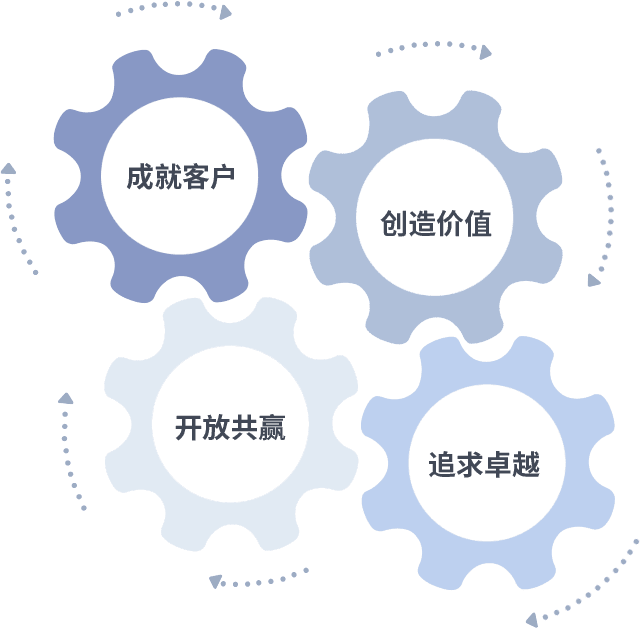 成就客户是一切决策的出发点,,,创造价值是衡量所有工作的标准,,追求卓越是我们做事做人的态度,,,,开放共赢是我们的格局也是最终的结果。。。。价值观的齿轮环环相扣,,推动着组织里的每个人不断向前。。