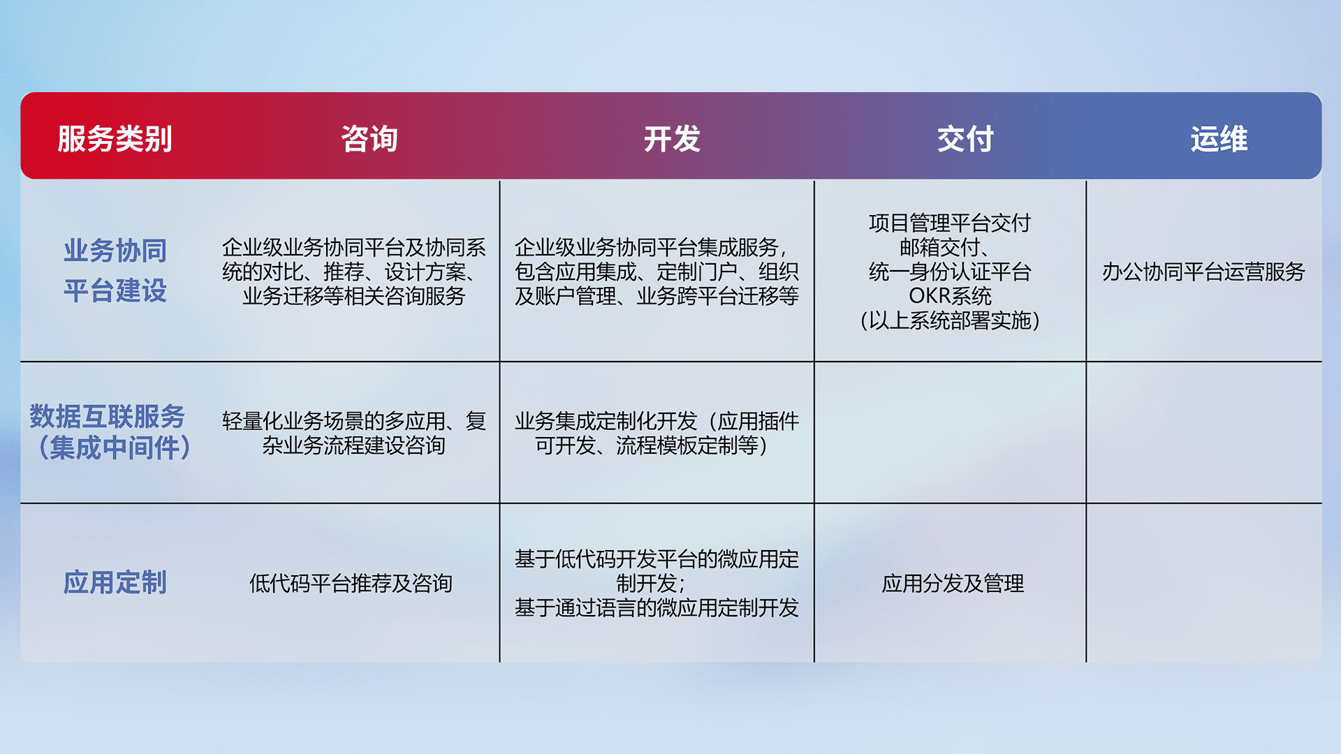 针对钉钉、、、企微、、IDaas等平台级产品提供产品的规划、、、、方案、、、、交付、、、定制化开发等服务,,实现如统一协同办公、、智能客户服务、、、混合会议管理、、、、智能数据查询、、、等业务场景,,,,实现数字化转型。。。。